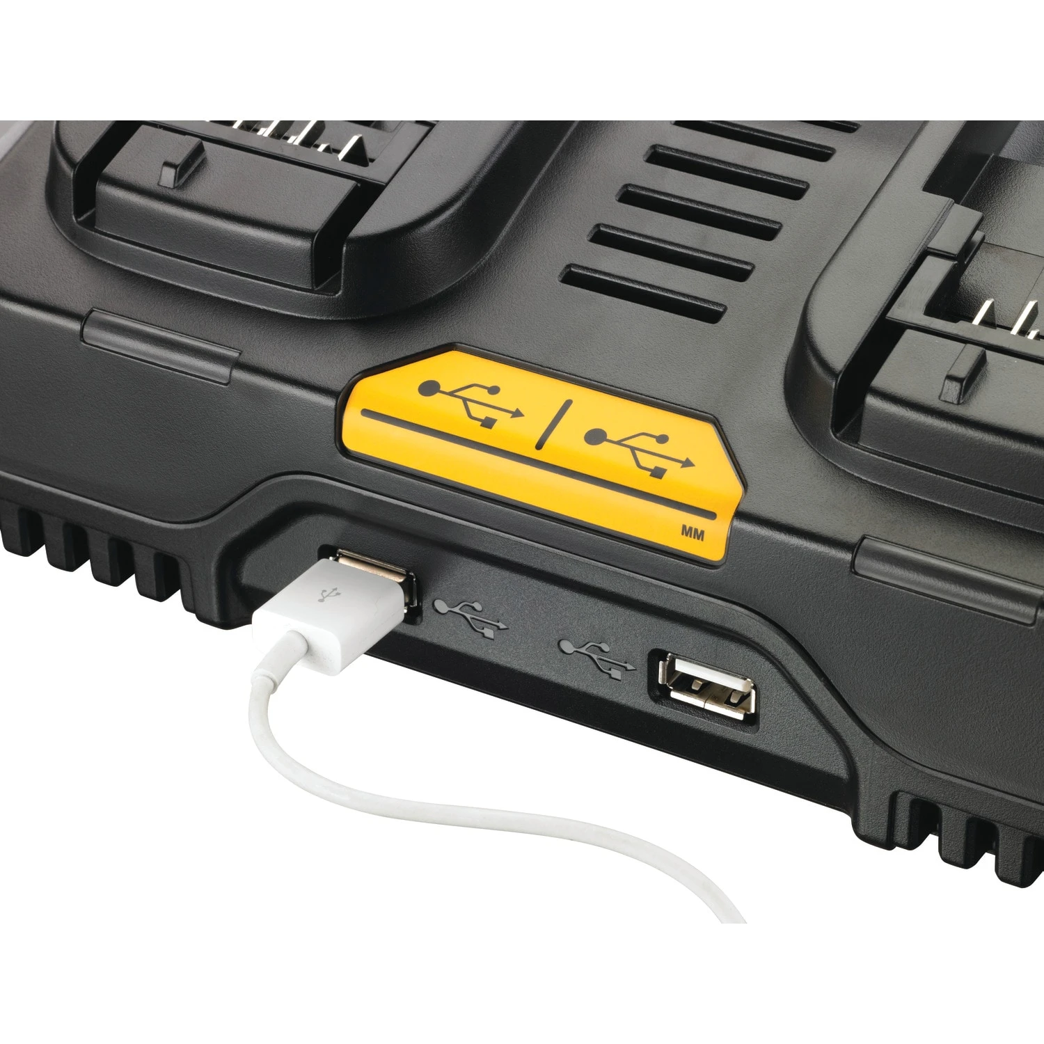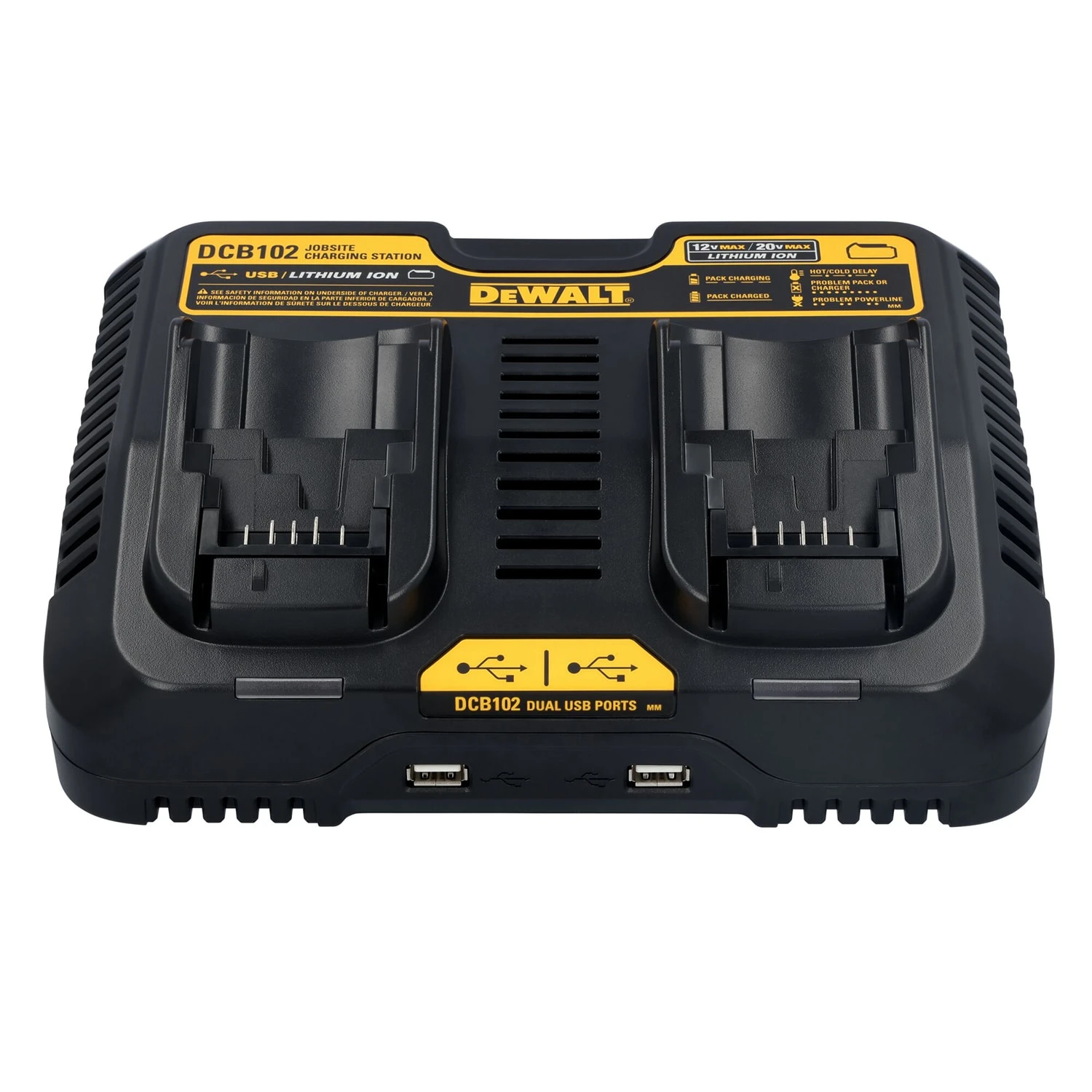 Simultaneously charges (2) DEWALT® 12V – 20V MAX* Li-Ion batteries