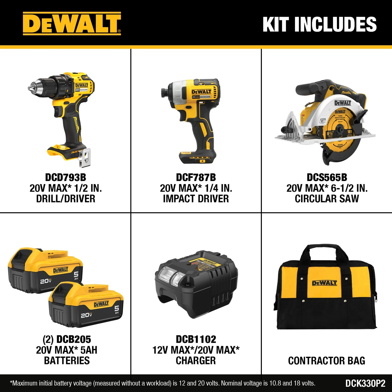 Includes: (1) DCD793B 20V MAX* Brushless Cordless 1/2-in Drill/Driver, (1) DCF787 20V MAX* Brushless Cordless 1/4-in Impact Driver, (1) DCS565 20V MAX* Brushless Cordless Brushless 6-1/2-in Circular Saw, (2) DCB205 20V MAX* 5Ah Battery, (1) Charger, (1) Contractor Bag