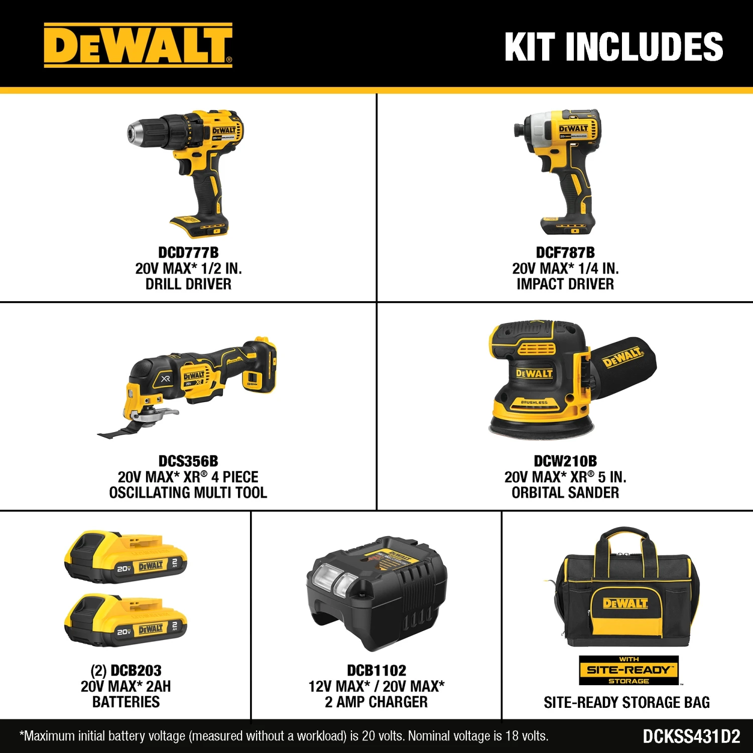 Includes: (1) 1/2-in Drill/Driver, (1) 1/4-in Impact Driver, (1) Oscillating Multi-tool, (1) 5-in Orbital Sander, (2) 2Ah Batteries, (1) Charger, (1) Site-Ready Storage Bag
