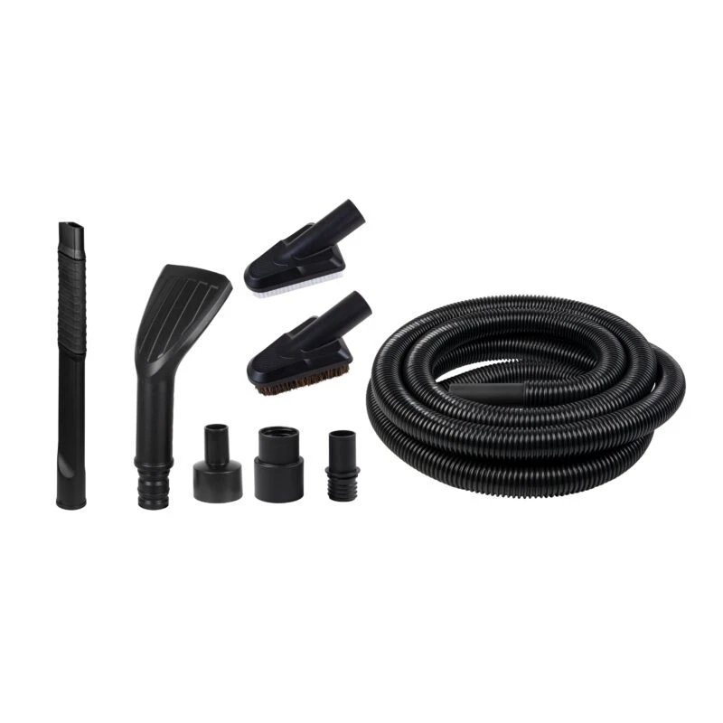 8-piece car cleaning kit includes a 1-¼” x 14.75 ft hose, a soft bristle brush, a stiff bristle brush, a claw utility nozzle, a flexible crevice tool, and adapters.