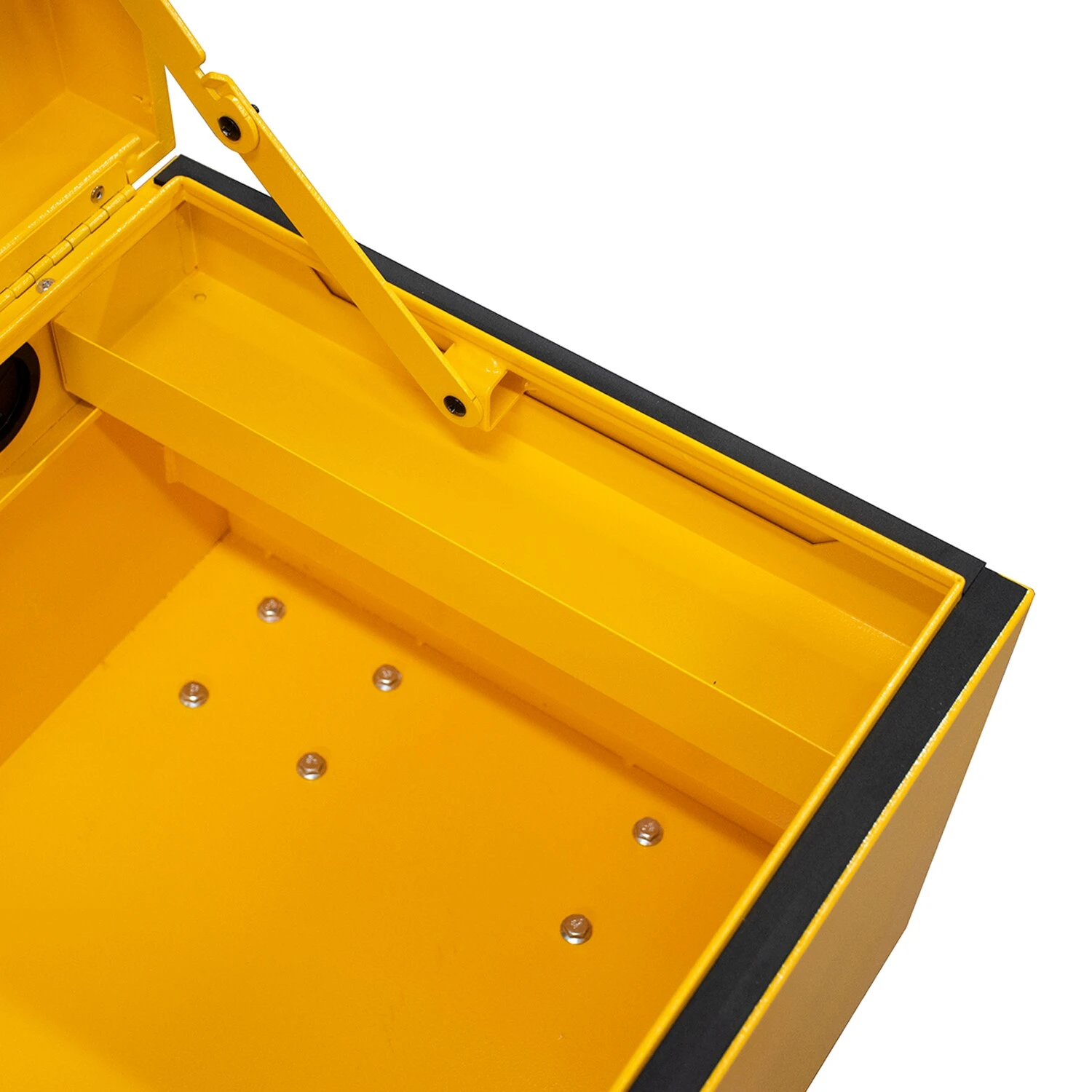 Convenient recessed swing-up handles for easy grip and 7-gauge forklift rails allow for easy movement of these tool boxes