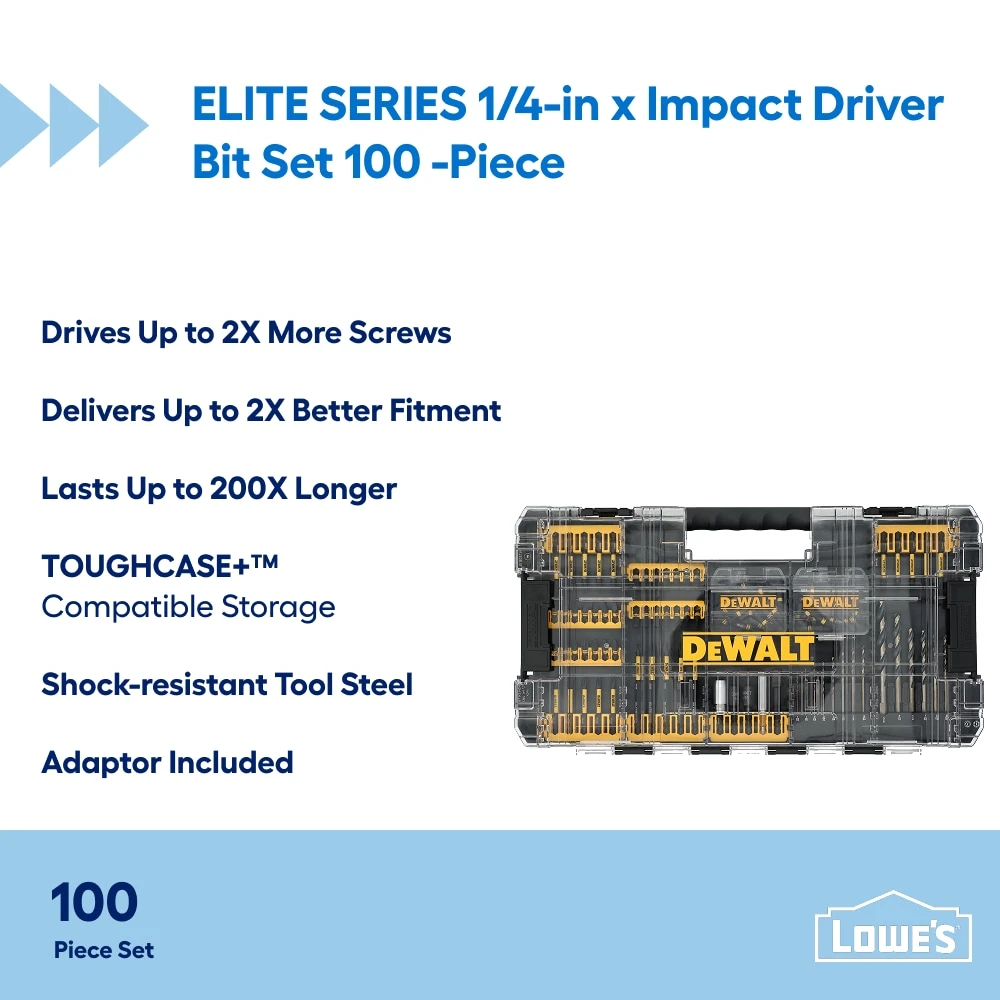 DISCLAIMERS: *On average vs standard DEWALT® screwdriving bits (see chart); †Bit life while setting screws vs Milwaukee® Shockwave® PH2 screwdriving bits; **Screw engagement vs Milwaukee® Shockwave® T20, T25, T30, and T40 screwdriving bits; ‡T10, T15, T20, T25, T27, T30 and T40 are trademarks of Acument Intellectual Properties, LLC, used without permission to indicate compatibility; Milwaukee and Shockwave are registered trademarks of Milwaukee Electric Tool Corp, which has not endorsed or approved this comparison