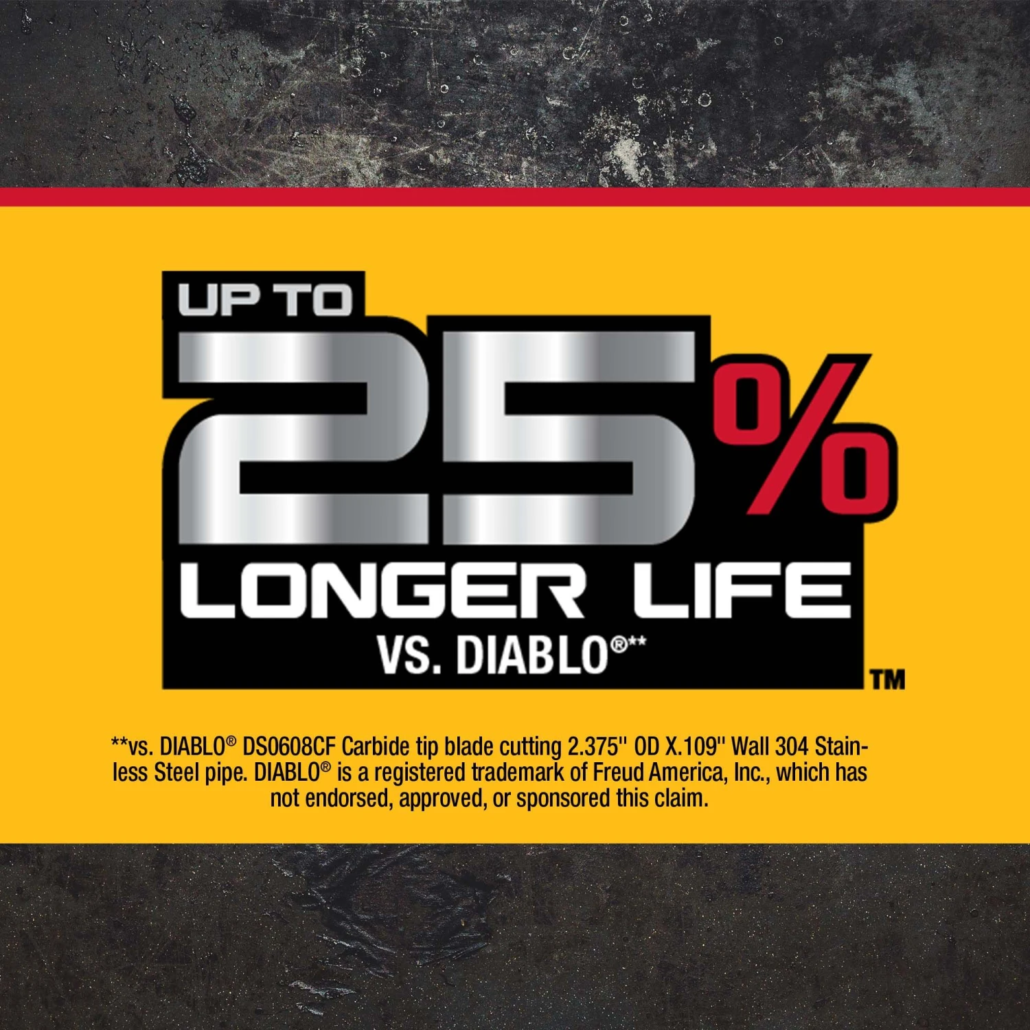 Versus DIABLO® DS0608CF carbide tip blade cutting 2.375-in OD X 0.109-in Wall 304 Stainless Steel pipe, DIABLO® is a registered trademark of Freud America, Inc, which has not endorsed, approved, or sponsored this comparison