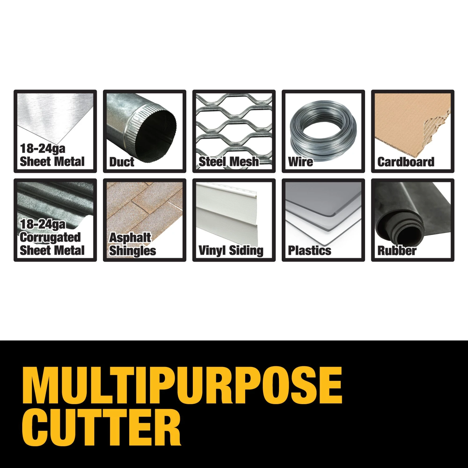 Cuts up to 18-gauge material including but not limited to: sheet metal, corrugated sheet metal, duct, asphalt shingles, steel mesh, vinyl siding, wire, plastics, cardboard and rubber